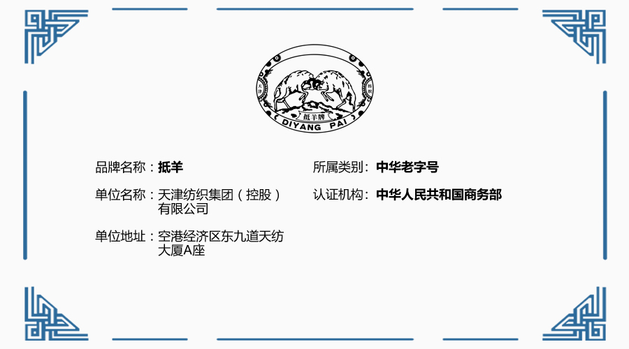 东亚抵羊公司成立至今已有85年的历史;“抵羊”牌商标1932年注册,至今已有87年的历史,成为了中华老字号。现今“抵羊”商标已经转让到天津纺织集团(控股)有限公司名下,我们集团有责任将民族品牌再次做大做强。