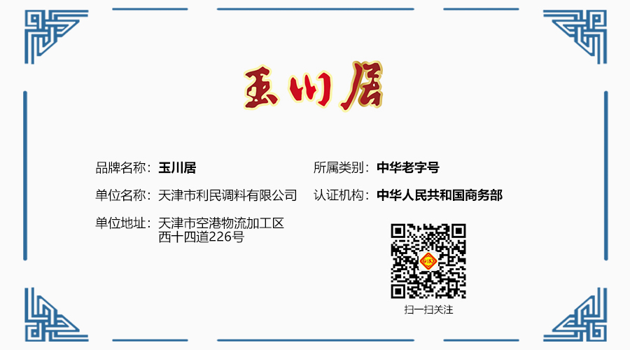 品牌简介:玉川居品牌从1920年创立至今,已历经近百年历史。多年始终保持传统工艺 ,选料精、制作细,深受消费者好评。至今全国仍流传着“津有玉川居,京有六必居”的说法。历年来,在玉川居人的精心呵护下,玉川居长盛不衰,为消费者提供着优质的高酱小菜,丰富着人们的餐桌。玉川居酱菜被商业部授予优质产品奖及国内贸易部授予“中华老字号”称号,“玉川居”商标被评为天津市著名商标。