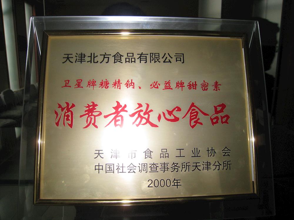 2000年“卫星牌”糖精钠、甜蜜素被天津市食品工业协会、中国社会调查事务所天津分所确认为“消费者放心食品”;