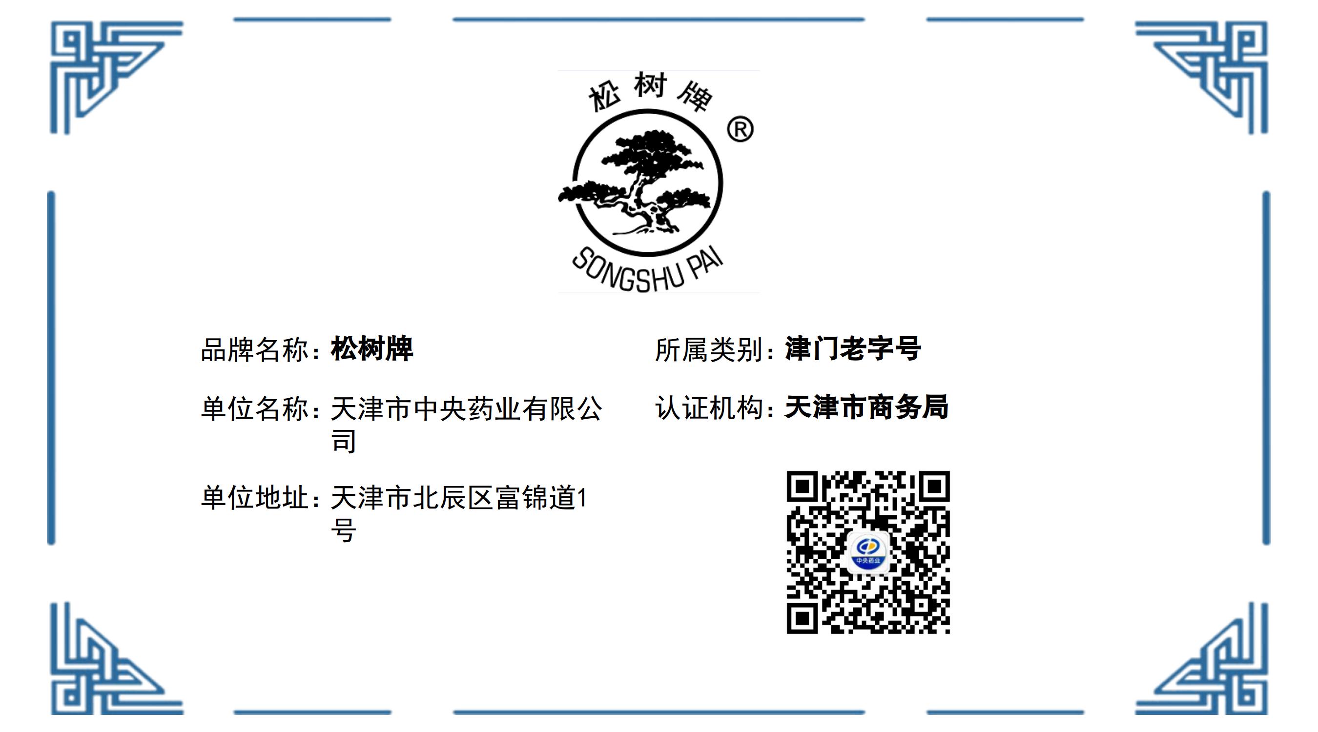 2001年“松树牌”商标被天津市工商行政管理局认定为天津市著名商标,成为国际、国内市场所公认的可靠品牌的标志,代表产品有人参精系列口服液、人参补丸、双清合剂等。2012年公司荣获“津门老字号”殊荣,“松树牌”商标获得“津门老字号”认定证书。2017年“松树牌”商标入选第一批天津市重点培育的国际自主品牌。2019年“松树牌”代表产品人参口服液制作工艺进入天津市和平区非物质文化遗产保护名录,双清合剂2020年、2022年两次被纳入《中成药防治新型冠状病毒肺炎专家共识》,2022年12月入选天津市卫健委发布的《天津市新冠感染者用药参考目录第一版》,充分肯定了其在新型冠状病毒肺炎疫情防控和救治中的重要作用